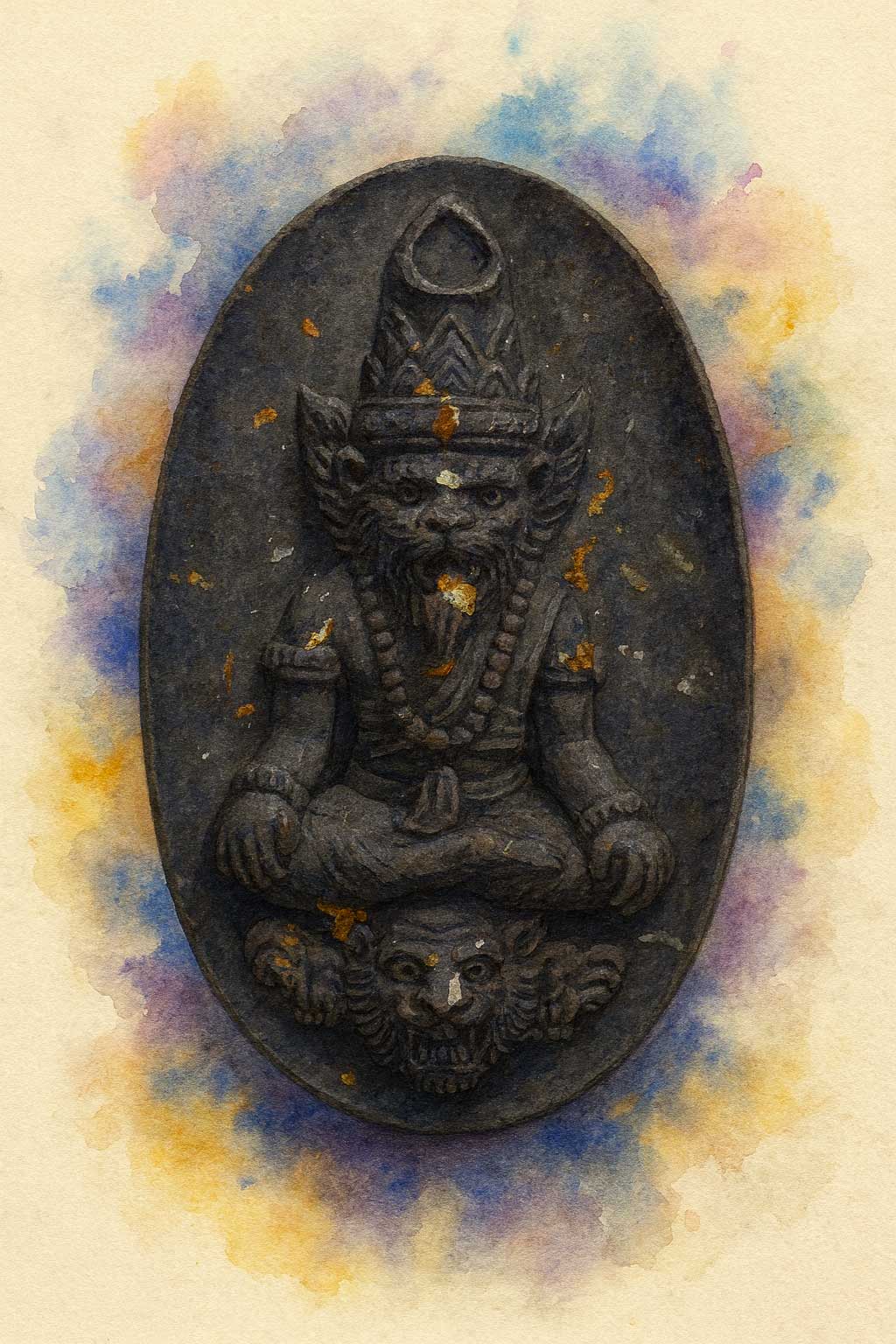 У центрі цієї містичної композиції сидить Він — Бором Кхру Пу Чао Самінг Пхрай. Його поза — це непорушний спокій медитації, лотос, що квітне посеред дикої хащі. Але погляд приковує не людське обличчя, а лик Тигра. Це маска звіра, або ж істинна сутність перевертня, що дивиться крізь віки. У цьому погляді сплелися дві протилежні стихії: холодна мудрість великого відлюдника-ришs та люта, нестримна сила хижака, що не знає страху.