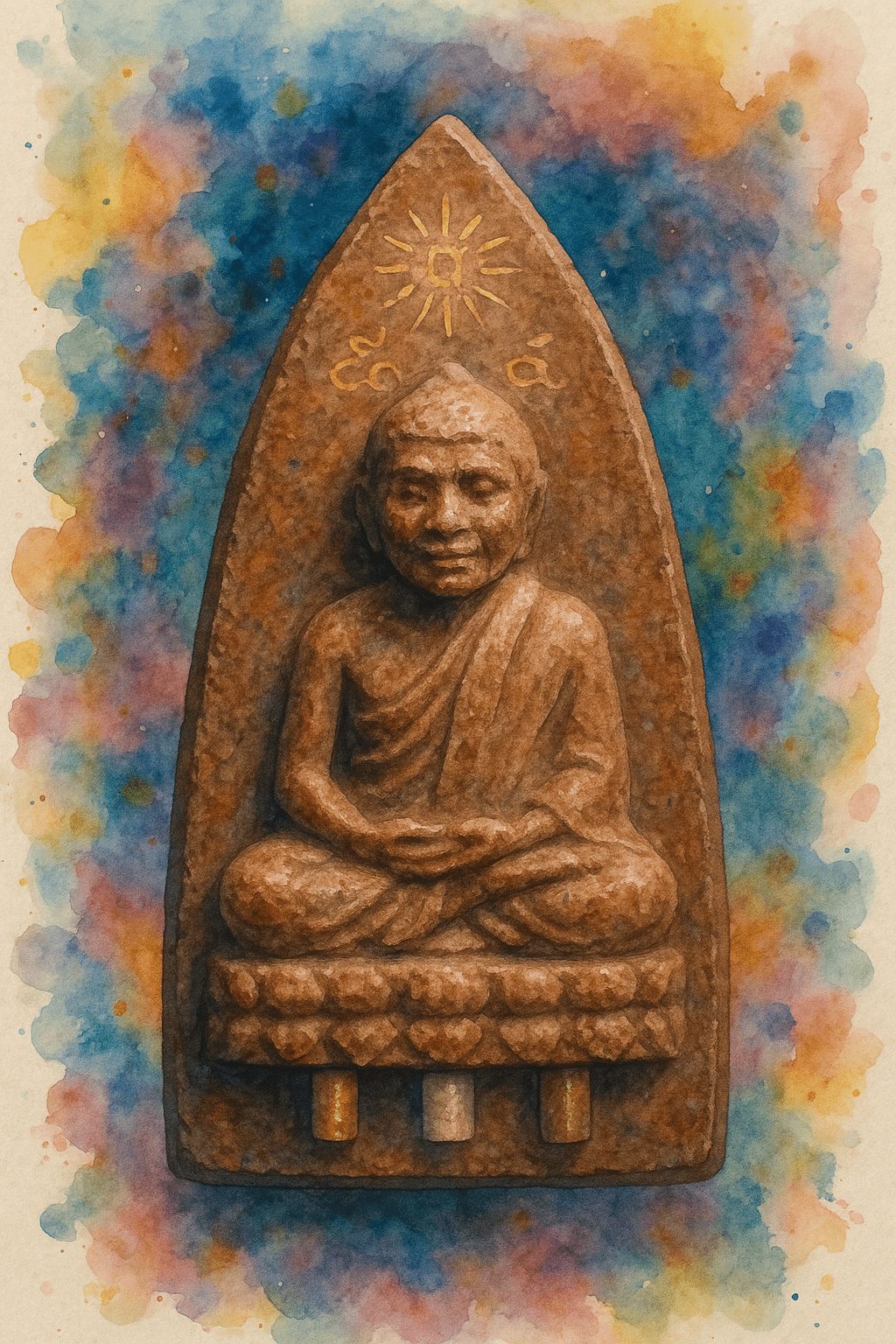 У моїх руках — темна трикутна постать, виліплена з сакральної речовини, відомої як Маха Ван 108. Вона ніби увібрала в себе порох з алтарів і попіл з ритуальних вогнів, аромат лісових трав і енергію далеких благословень. Це не просто форма — це присутність: фігура Луанг Пхо Туата, якого в Таїланді називають святим, що ходить по хвилях. Його риси — нерівні, стирані часом або задумом, але в них — спокій глибокої впевненості, мовчазної сили, що не змагається, а оберігає.