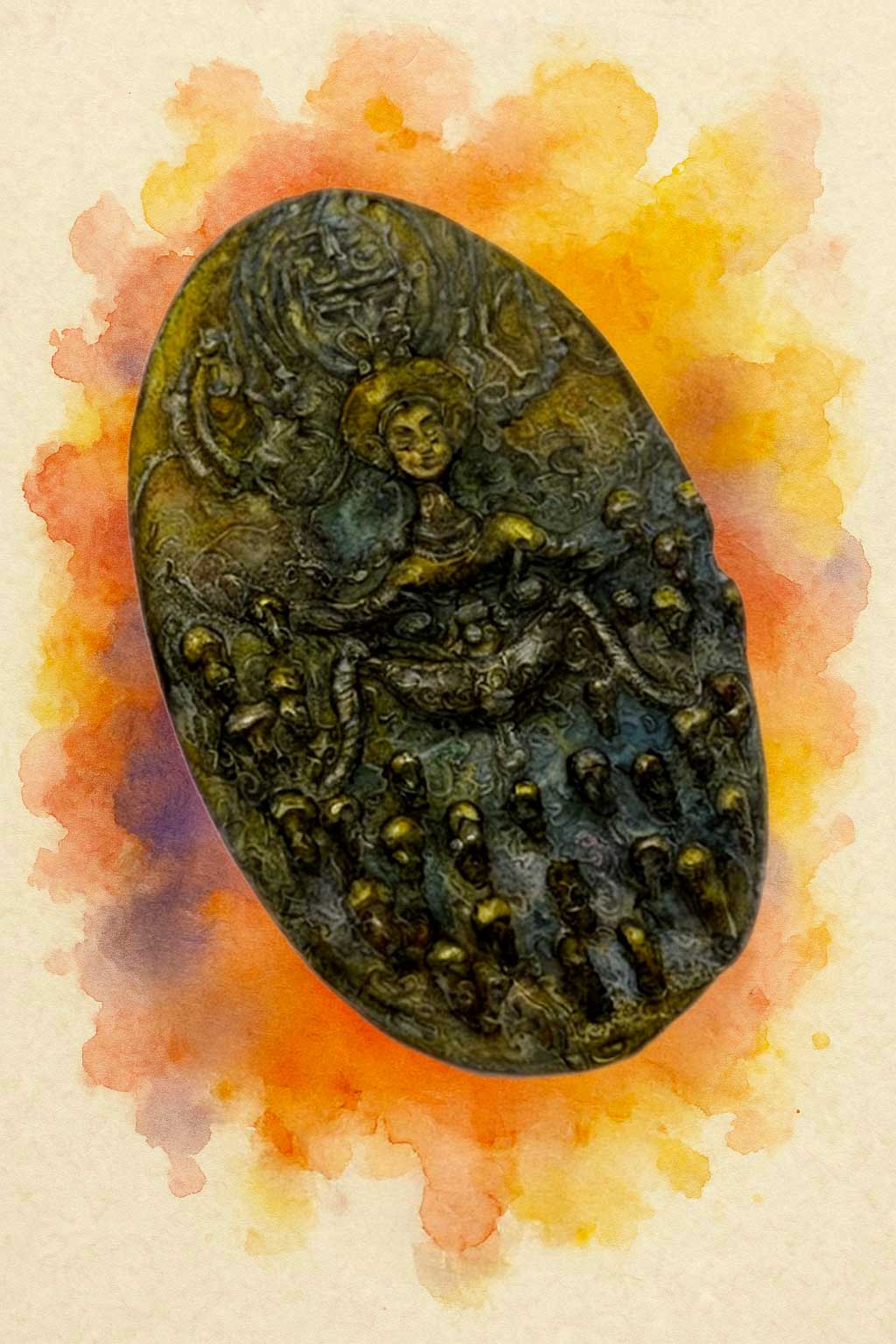 Над головою Nang Pheua вирізьблено древній yantra, коло знаків, подібних до тих, що писалися саєт-тушшю на шкірі монахів, щоб захищати від злих духів і відкривати шляхи удачі. У цьому yantra — її печать, знак того, що сила приборкана, але не знищена. Коли дивишся на цей амулет, здається, що метал ще зберігає відблиск полум’я, у якому його колись освячували — дим ладану, шепіт ajarn Sumpati, глибокий гул мантр, що розчиняється у нічному повітрі храму Wat Phra Phutthabat Ratchaphruek.