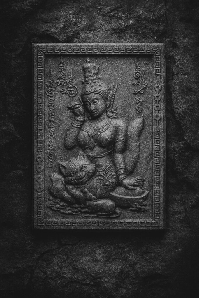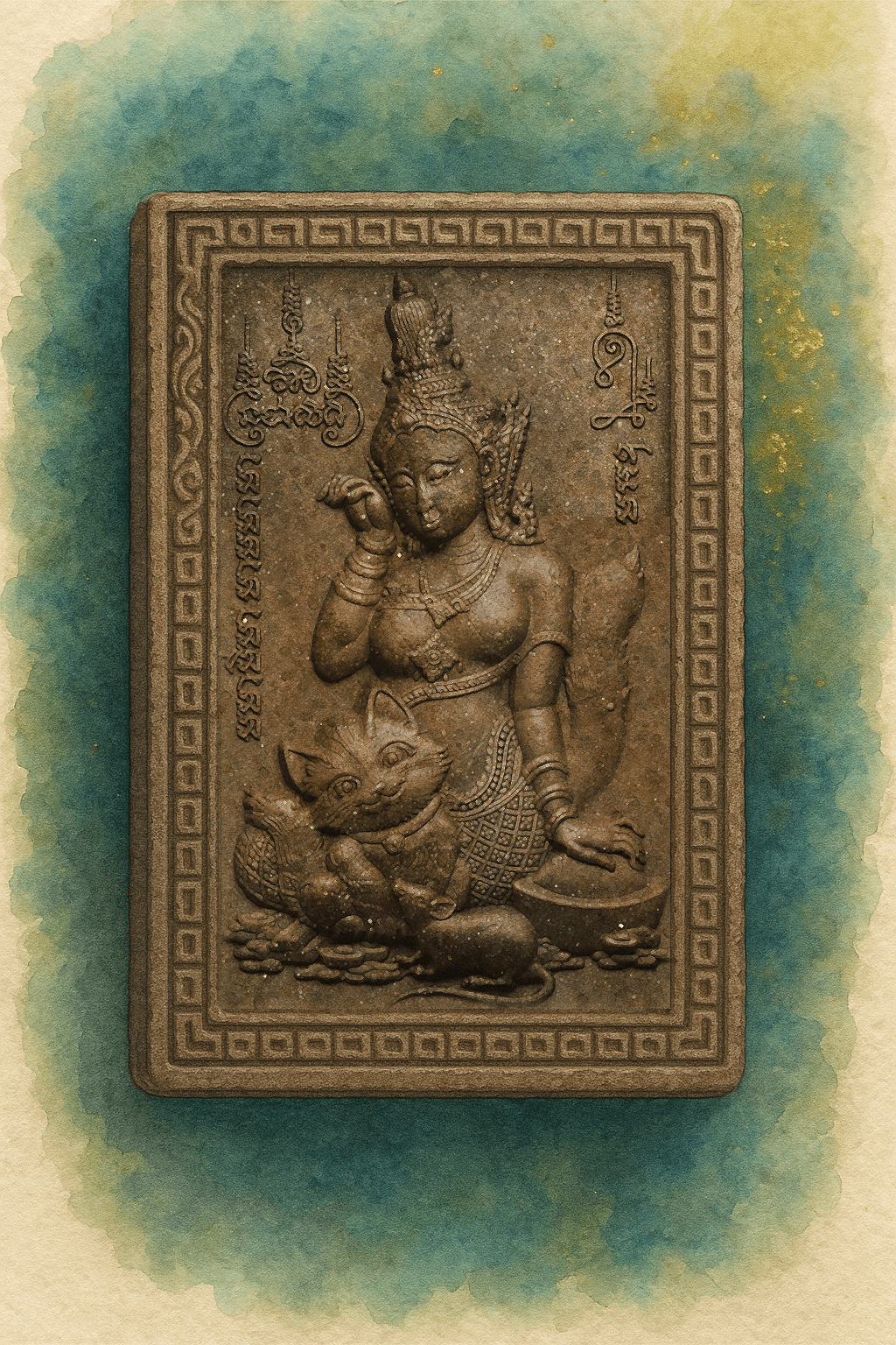 У сутінковому світлі храму, де ладанова мла розчиняє межі між видимим і незримим, лежить амулет, у якому застигла притча про неможливе. Nu Kin Nom Maew — не просто витвір, а відбиток глибинного парадоксу, в якому зустрічаються вороги, щоби перетворитися на союзників. У чорному тілі амулета, важкому як зола після спаленого кармичного вантажу, викарбувано богиню, що тримає в собі як материнську лагідність, так і сувору незворушність. Її погляд — у вічність, її поза — спокій, а біля її грудей — миша, що смиренно п’є молоко з пащі кішки.