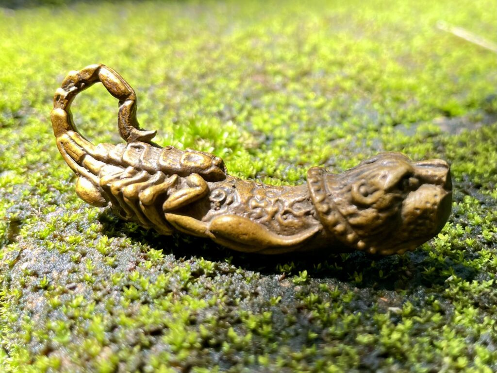 Скорпіон — інший полюс цієї істоти. Його спина витесана так точно, що здається — він ось-ось поворухнеться. У його сегментах закодовано пам’ять про боротьбу. У жалі — обіцянка відплати. У Таїланді вірять, що такі образи, коли освячені у храмах — зокрема в монастирях Південного регіону, де практикують глибоку магію дерев і тіней, — здатні блокувати прокляття, відводити чаклунські атаки і навіть розчиняти хворобу, якщо вона прийшла як наслідок енергетичного порушення.