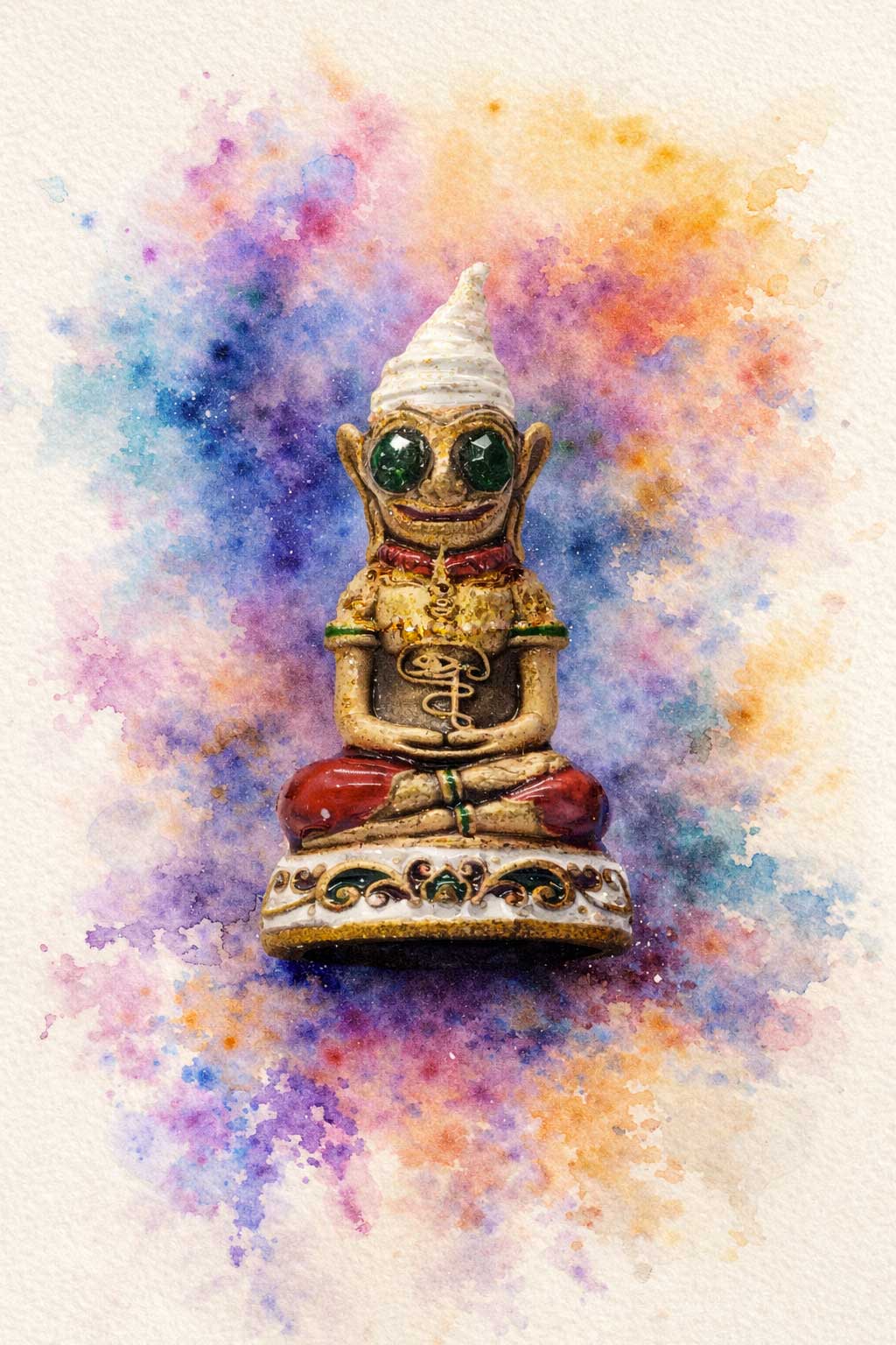 Це не просто зображення божества; це застиглий у матерії відгомін давньої кхмерської магії Сайясарт. Створений спадкоємцем великих чаклунських традицій, майстром Луанг Пхо Вінью, цей амулет несе в собі відбиток містичної спадщини Аджана Суана — легендарного ченця, який вмів розмовляти з духами та укладати з ними угоди. Саме на руїнах старого цвинтаря, у місці колосальної концентрації спіритичної сили (Хєн), відбувався ритуал пробудження цієї сутності.