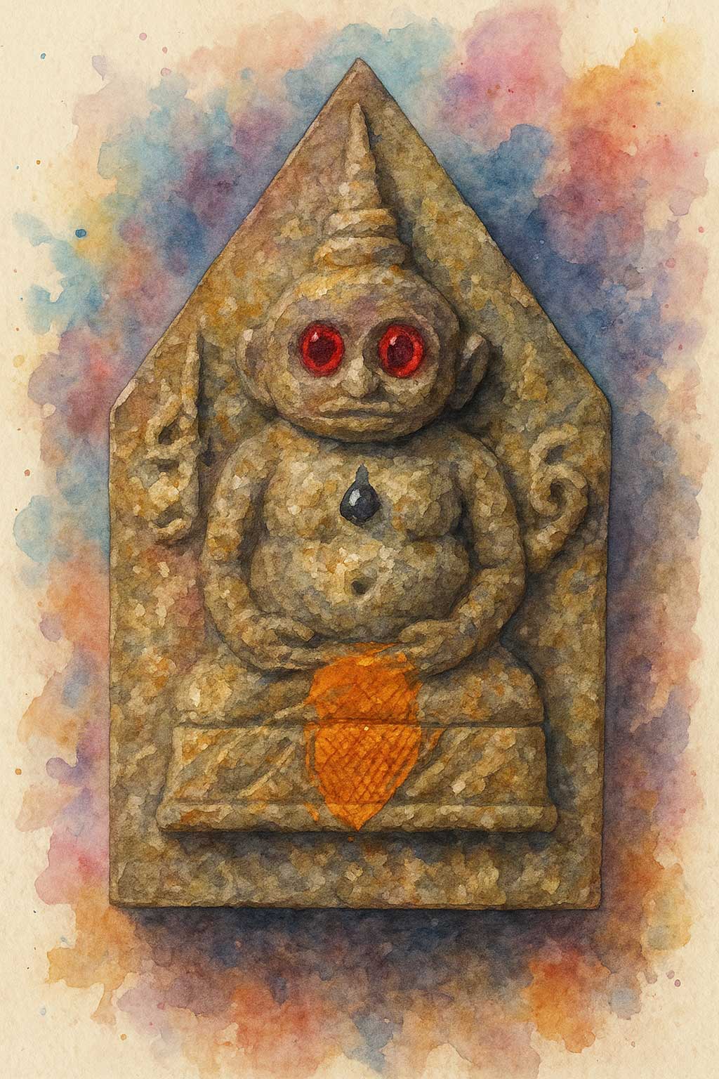 Цей амулет — як оберемок стихій, з’єднаних у тіло одного талісману. З одного боку — Phra Khun Paen, зображений не як воїн у броні, а як маг в епіцентрі чарівної вежі. Його тіло оточене фігурами бажань — жінки, зброя, вогняні руни. У центрі грудей — червоний камінь, немов серце, що б’ється у ритмі приваблення. Це не просто амулет любові — це магніт, здатний втягнути навіть нерішучість.
