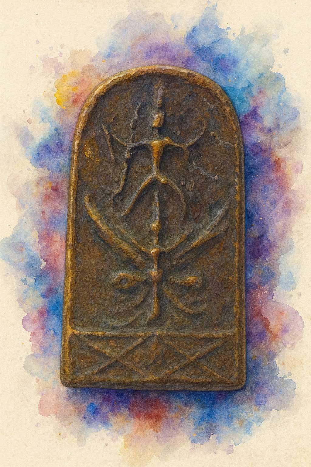 На передньому боці амулета — образ Вішну, вічного охоронця світового порядку, що стоїть на спині Ґаруди — крилатого царя істот, який прорізає простір між небом і землею. Постать груба й рельєфна, створена не для краси, а як карб духовної сили. Метал темний, у тріщинах часу, ніби ввібрав у себе тисячі молитв, мантр, вітру й диму від свічок.