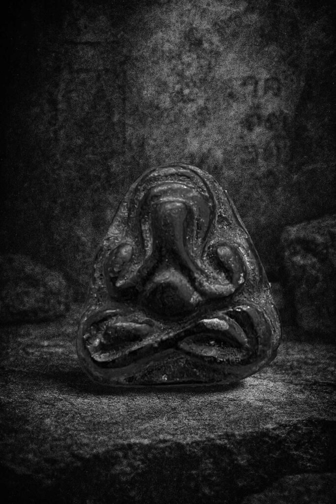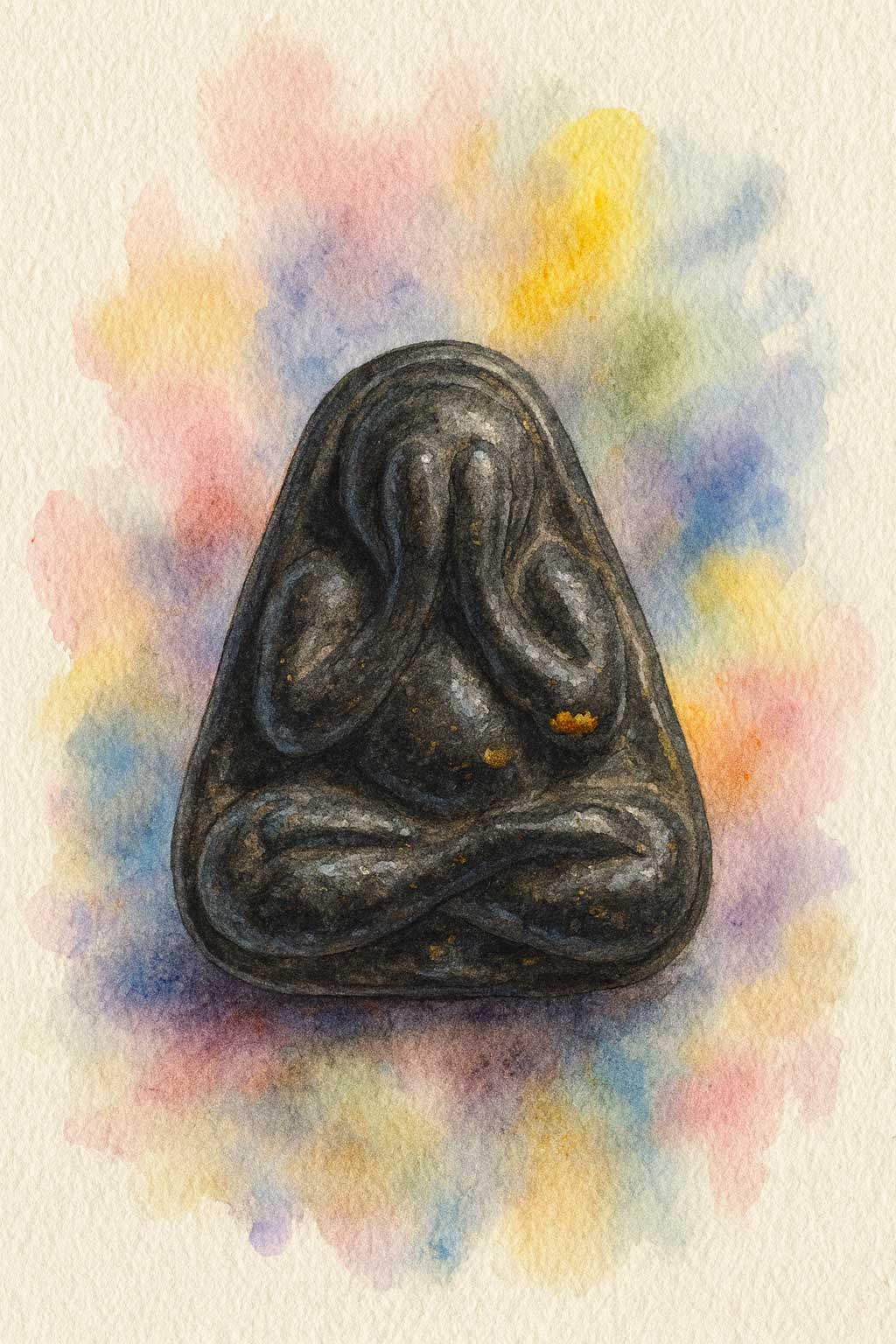 У маленькому чорному тілі, схожому на застиглу краплю нічного лаку, ховається тиша, що старша за храми. Це Пхра Пітта Луанг Пу Чіна — той, що сидить, прикривши обличчя руками, у глибокій самозабутій молитві. Він не дивиться на світ — не через страх, а через прозріння: усе, що треба бачити, вже є всередині.