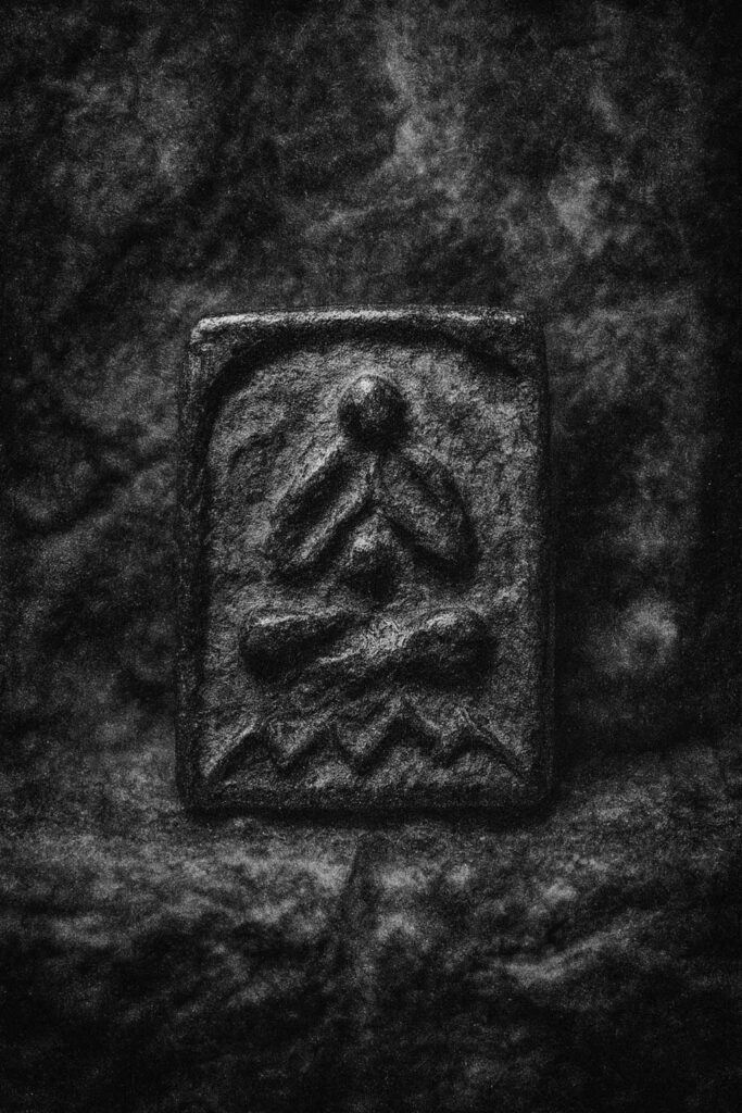 На темній поверхні амулета огортаєш поглядом фігуру Phra Pidta — концентровану постать, яка гордо сидить, руки притиснуті до очей у жесті глибокої внутрішньої медитації. Тло металева, з часом озерніє до ніжного графітового відтінку, а тонкі частки золотої фарби блискуче проступають на грудях і колінній ділянці — мов тихі сліди благословінь майстра. Через легку нерівність поверхні і витончені лінії символів видно сліди сакральної висвяти та енергії Wicha, якою володів Luang Pu Suk.