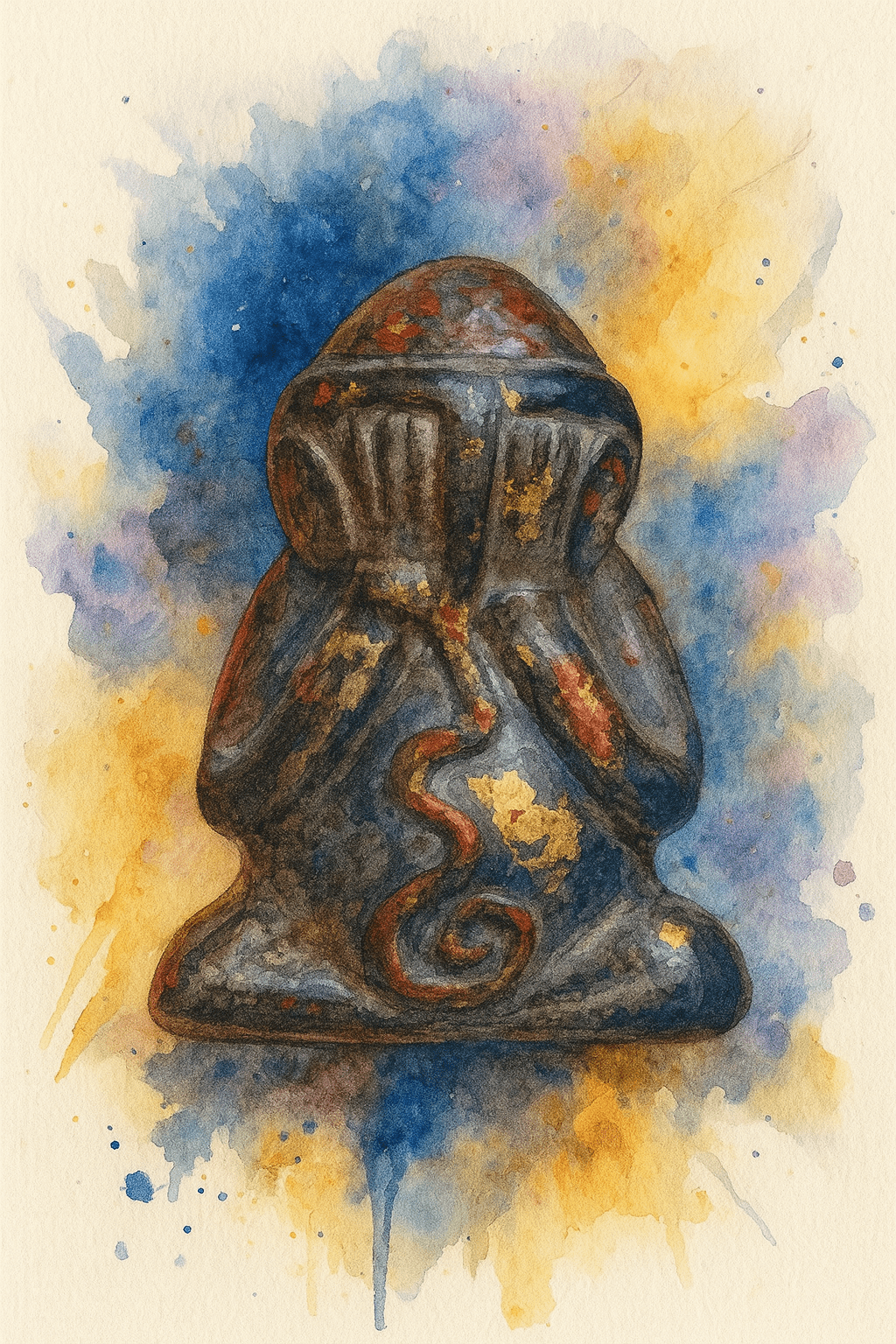 Його основа — священний сплав металів, створений за давніми формулами, із вкрапленнями червоного лаку та залишками позолоти, що трималася не на клеї, а на благословенні. Амулет не блищить, хоч і металевий — його поверхня потемніла, ніби зібрала на собі попіл і дим століть. Він важкий не лише фізично — він несе тягар захисту. Це не прикраса і не талісман для гри. Це супутник. І щит.