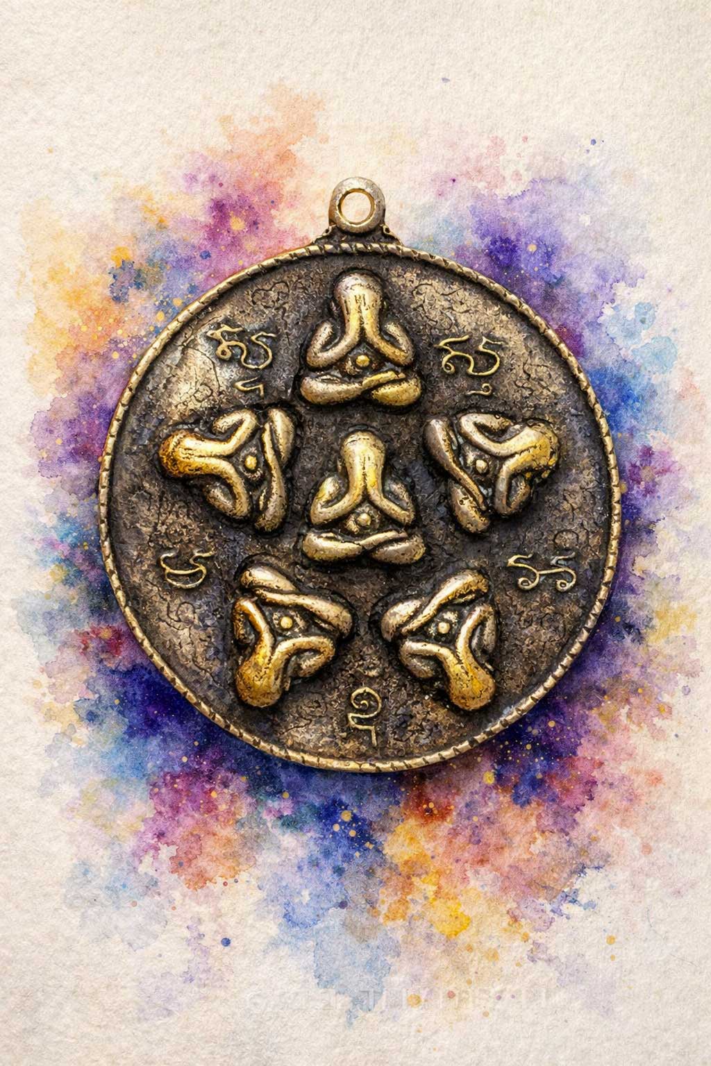На лицьовому боці амулета, у вічному колі, завмерли п’ять фігур. Це архітектори тиші. Їхні долоні, притиснуті до облич, — це не жест страху чи втечі, а символ абсолютної відмови. Відмови бачити ілюзорність світу, чути його галас, відчувати його біль. Вони перебувають у стані «Ніродха» — священного припинення страждань, де зовнішній хаос розбивається об стіну внутрішнього спокою. Ці п’ять образів уособлюють п’ятьох Будд нинішньої епохи, створюючи сакральний контур, замкнене коло духовної чистоти, крізь яке не здатне просочитися зло.