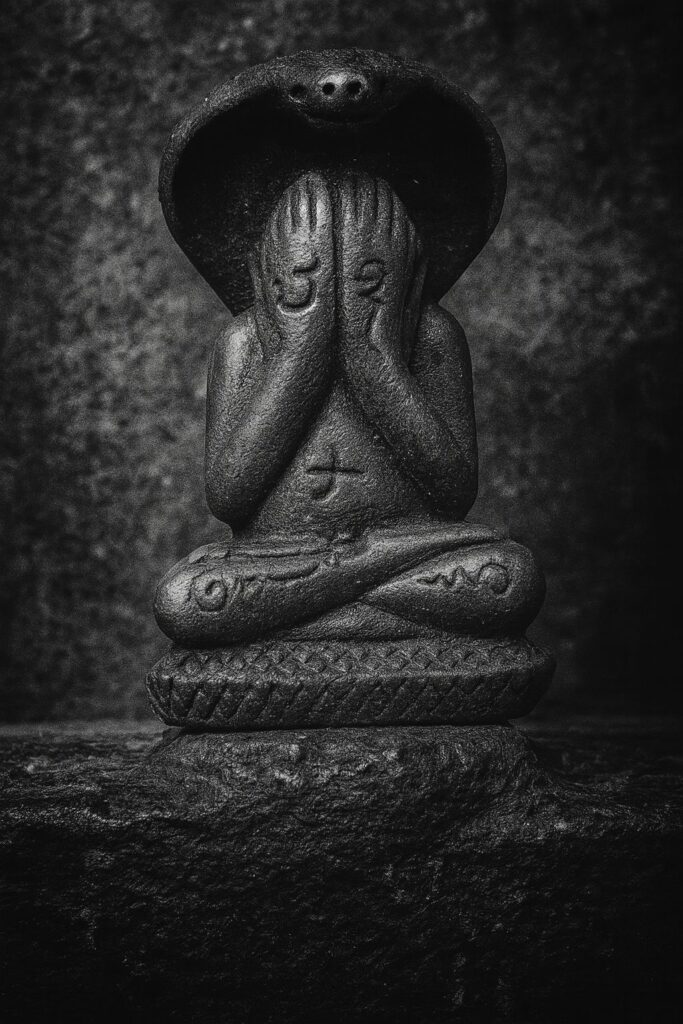 Темний, зворотний метал, із якого він зроблений, — це не просто матеріал, а уламок молитви, спресованої з уламків старих амулетів, оберегів і тіней. У кожній тріщині на його тілі — слід від давніх ритуалів Кхао Ор — найдавнішої школи бойової магії й окультизму Півдня. Там, де межа між монахом і чаклуном стирається, там народжується така форма. Форма, що сидить у позі замкнення, руки — як дві завіси, за якими палає спокій.