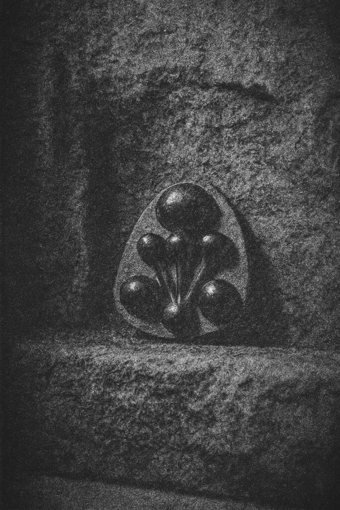 Він не має лиця, не має рук, не має тіла, що нагадувало б людину чи божество. Його образ — це п’ять темних сфер, що виростають із центру, подібно до паростків у невидимому ґрунті. Верхня — найбільша, як око, що бачить крізь ілюзію. Чотири нижні — мов чуття, що спрямовані назовні, але ніколи не торкаються світу. У цій формі — мовчазна закритість, концентрація енергії, що не витрачається даремно.
