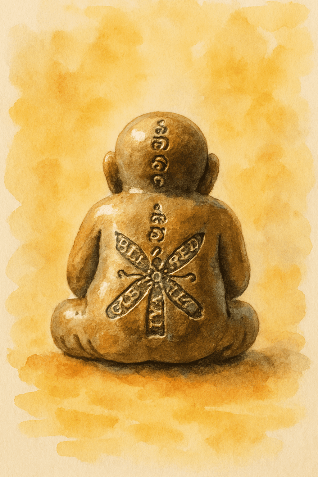 На спині кожного з тисячі створених амулетів з’явилася Бабка. Не просто комаха, а символ трансформації, швидкого польоту через лабіринти часу та простір, що уособлює здатність проникати крізь перешкоди до світла. Вона, як і сам Phra Pidta, є провідником: бабка, що легко ширяє над водою, і Phra Pidta, що перетинає кордони невідомого. Цей символ — таємна мапа, що веде до “ทะลวง ดวง เกิด” (Пробивання Долі), до звільнення від оков невдач і до відкриття незвіданих шляхів багатства та процвітання.
