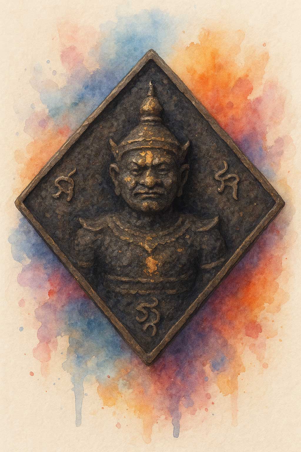 Цей рідкісний амулет належить до категорії захисних талісманів у традиції шанування Тхао Вессувана — божества-охоронця світу людей, духів і скарбів. Його форма — ромб, що символізує стійкість і рівновагу. На реверсі зображений переможний барабан, асоційований із тріумфом і духовною силою. Амулет поєднує впливи ритуальної магії янтра і віру в непереможну силу небесного охоронця, що захищає від демонів, чорної магії та злих намірів.